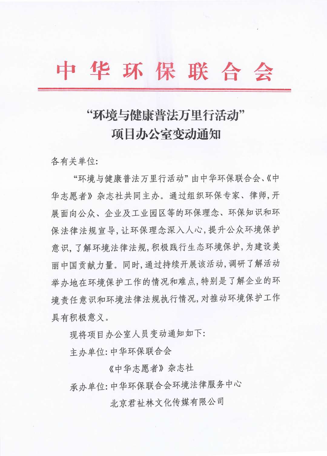 “环境与健康普法万里行活动”项目办公室变动通知