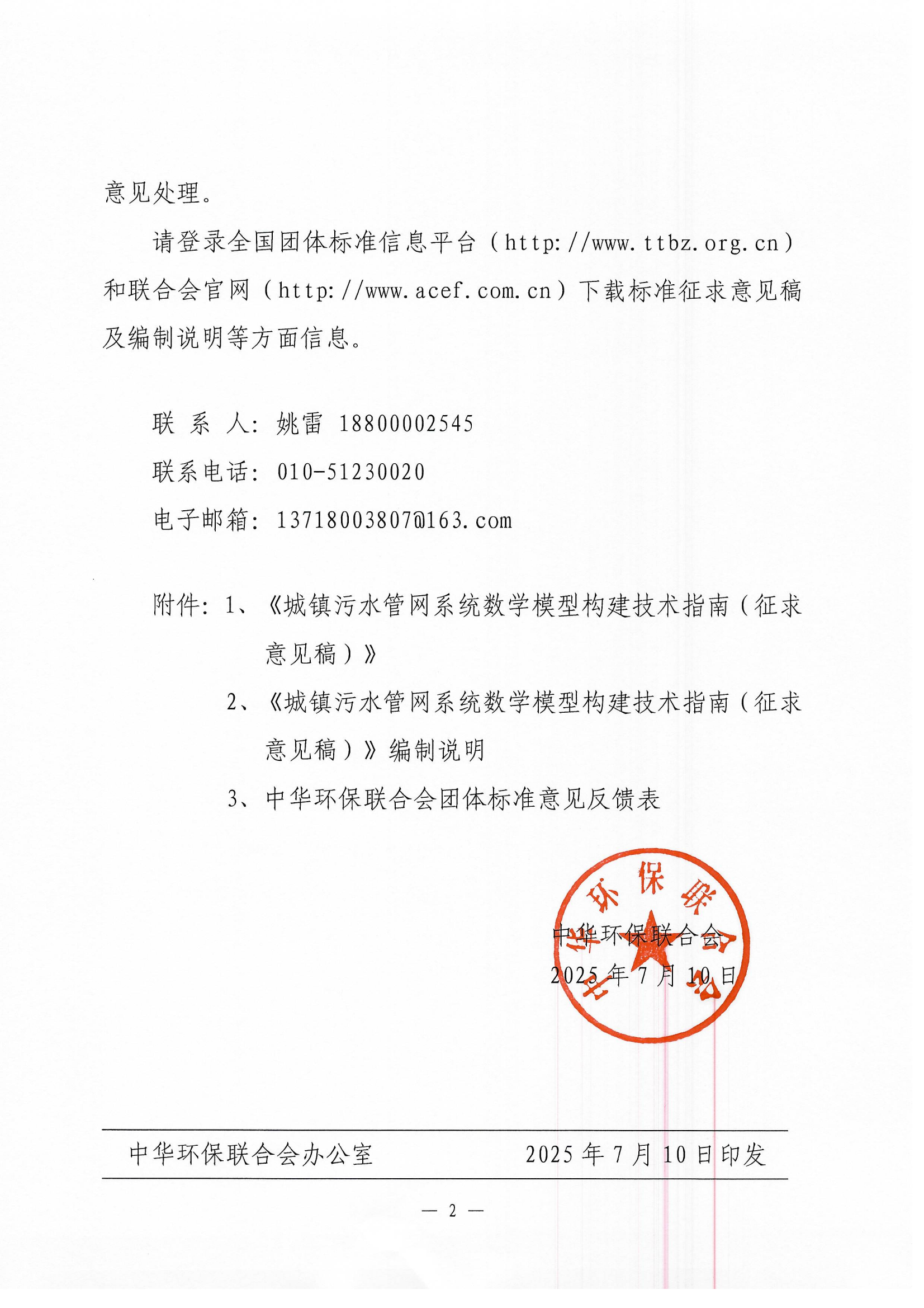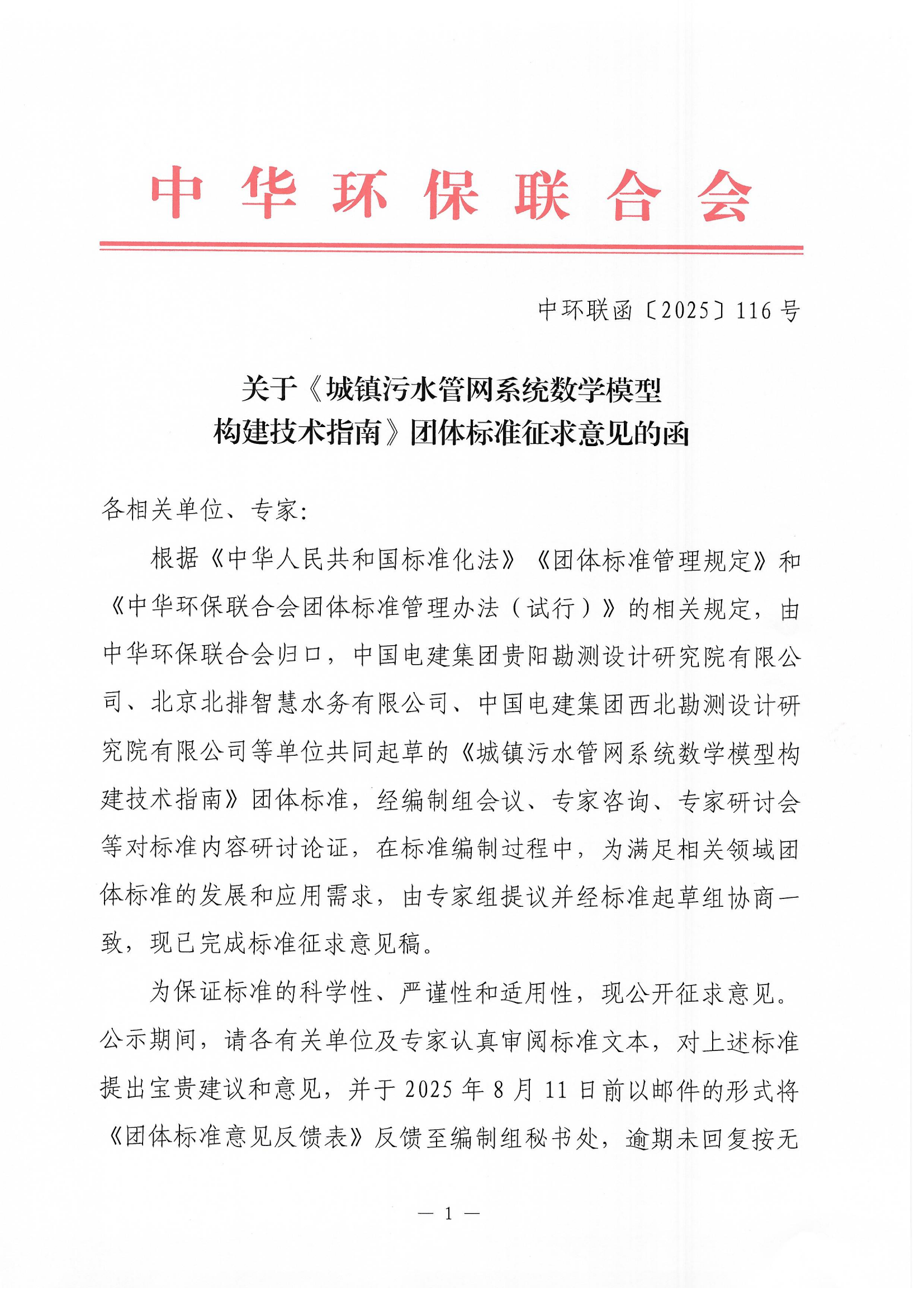 关于《城镇污水管网系统数学模型构建技术指南》团体标准征求意见的函