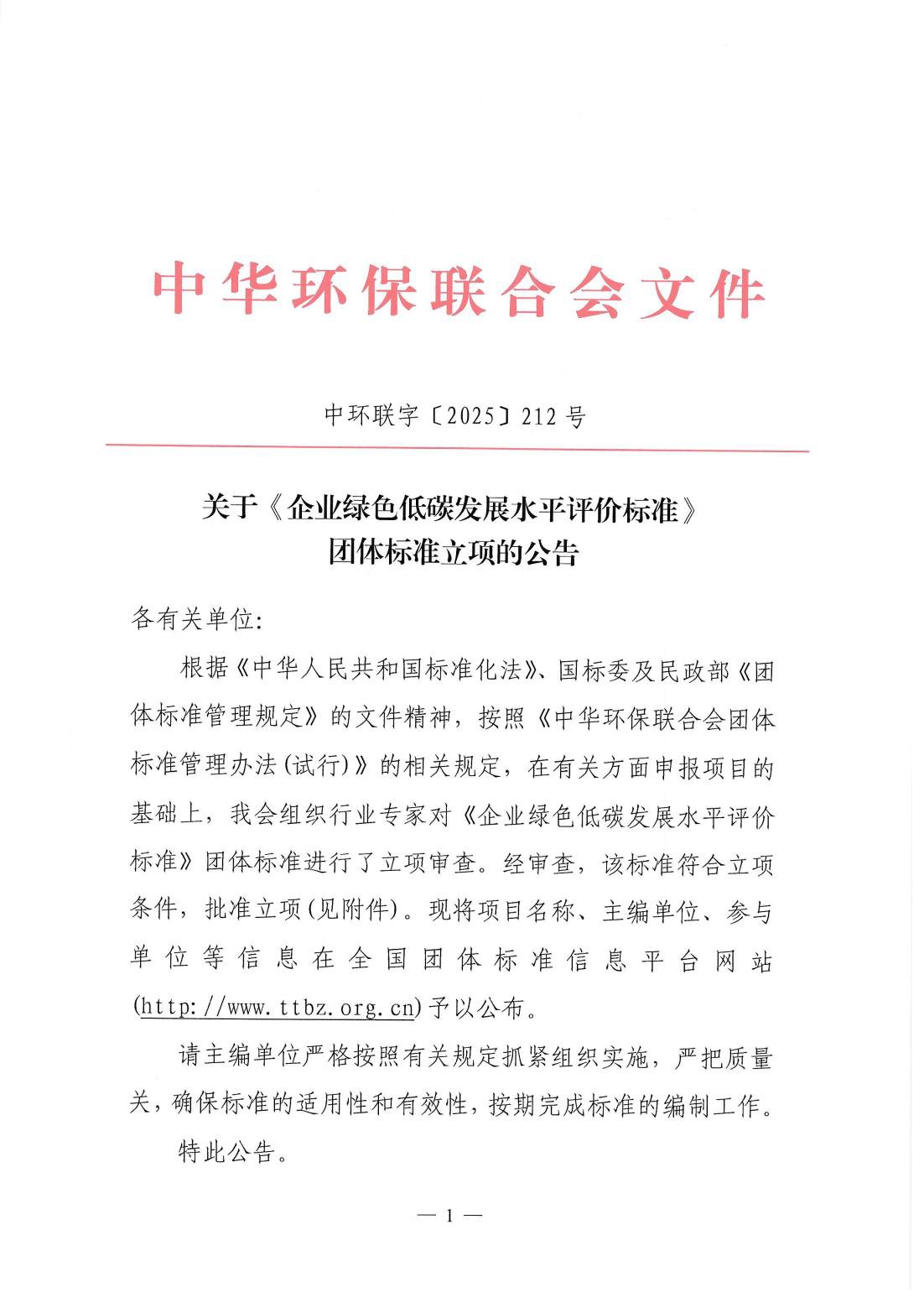 关于《企业绿色低碳发展水平评价标准》团体标准立项的公告