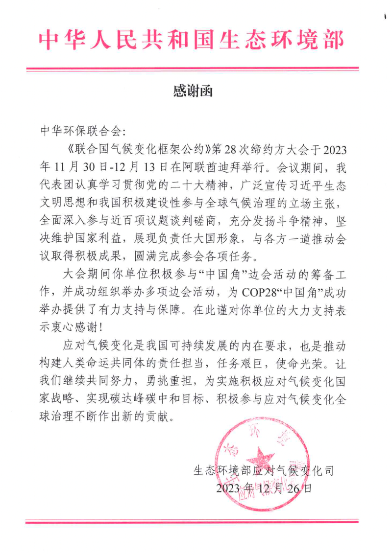 12月26日,中华环保联合会收到生态环境部应对气候变化司函件,对联合会在《联合国气候变化框架公约》第28次缔约方大会期间为中国角做出的贡献表示感谢。本次气候大会期间,中华环保联合会深度参与和支持了中国角相关事务,组织了多场边会活动并参与了中国角主题纪念品设计制作、场地设计和物流保障等工作,同时还于大会蓝区筹备了Solar+馆和多场联合国官方边会展览,向与会各国来宾系统展示了应对气候变化的中国民间行动。