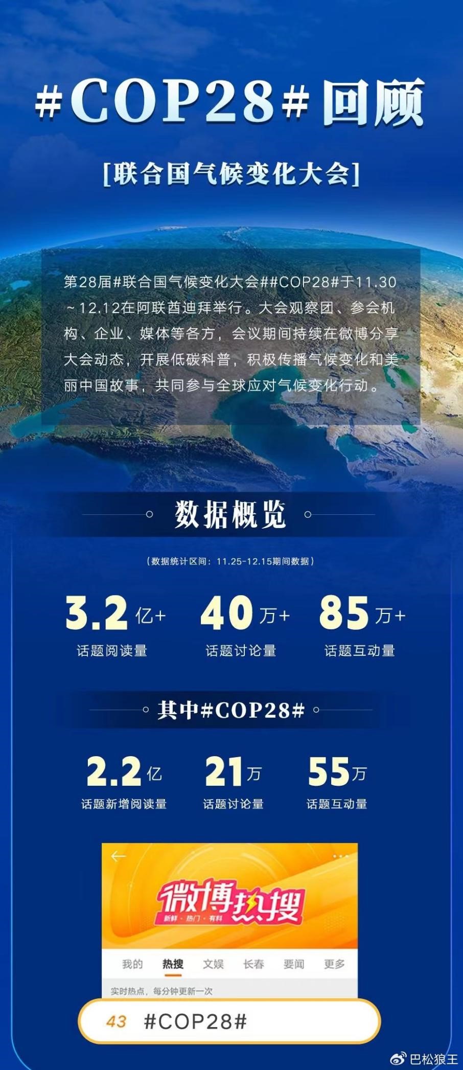 此外,由中华环保联合会杜少中副主席(@巴松狼王)牵头协调,并得到微博平台支持和众多大V积极参与的气候大会微博观察团和相关话题,在大会期间也获得了全社会的广泛关注。截止12月15日,#联合国气候变化大会# 和#COP28# 两个话题共获3.2亿阅读量,以及超过85万的话题互动和40万的线上讨论,实现了气候话题的有效破圈。在讲好中国故事、提高公众认知、推动公众参与全球应对气候变化行动上发挥了积极作用。