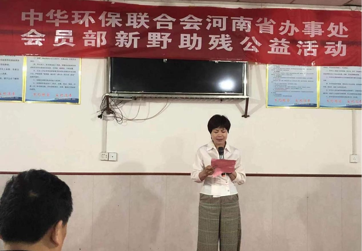 刘春梅部长在致辞中说,中华环保联合会河南省办事处积极践行“绿水青山就是金山银山”的理念,充分发挥桥梁和纽带作用,积极为各级政府和职能部门建言献策,凝聚各界力量,加强环境保护,保障公众健康。 为迎接第33个“全国助残日”的到来,中华环保联合会河南省办事处坚持民生至上,携手生态环境志愿者服务队传递爱心,慰问老人,以实际行动传承“尊老敬老、爱老助老、扶弱助残”的传统美德,共同构建和谐社会。她表示,中华环保联合会河南省办事处将进一步整合公益资源,带动社会各界关爱残疾人、孤寡老人,为建设和谐社会做出更大的贡献。言恳意切的讲话赢得阵阵掌声。