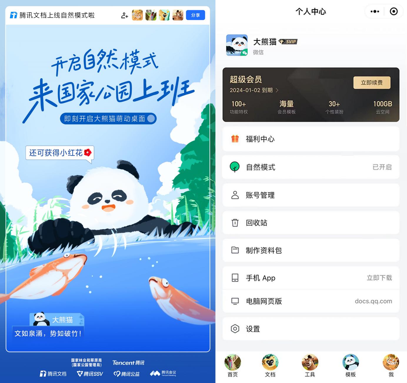 12月20日,国家林业和草原局联合腾讯在数字化办公工具腾讯文档中推出全新“自然模式”,让大熊猫、海南长臂猿、东北虎等国家公园及候选区旗舰物种和自然风光,通过界面装扮、定制背景、个性头像等多种方式,融入线上办公场景,邀请用户“在国家公园上班”。