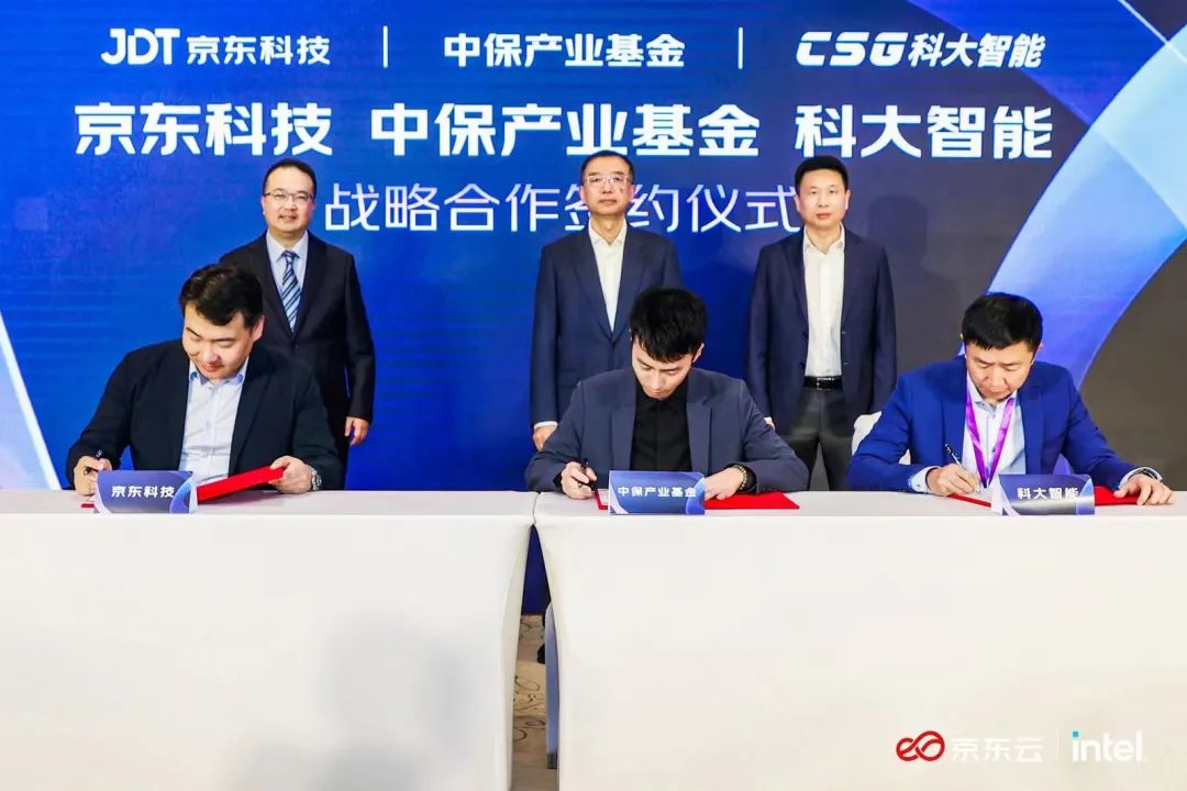 科大智能董事长黄明松先生,与京东集团副总裁、京东云总裁高礼强先生、信保基金总经理迟为国先生,共同出席见签战略合作签约仪式。