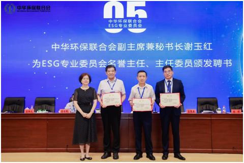 中华环保联合会副主席兼秘书长谢玉红宣读了中华环保联合会《关于同意成立“中华环保联合会ESG专业委员会”的批复》,并为中华环保联合会ESG专业委员会名誉主任、主任委员颁发聘书,为新批准的理事单位授牌。