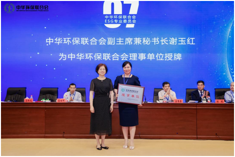 中华环保联合会副主席兼秘书长谢玉红为中华环保联合会理事单位授牌
