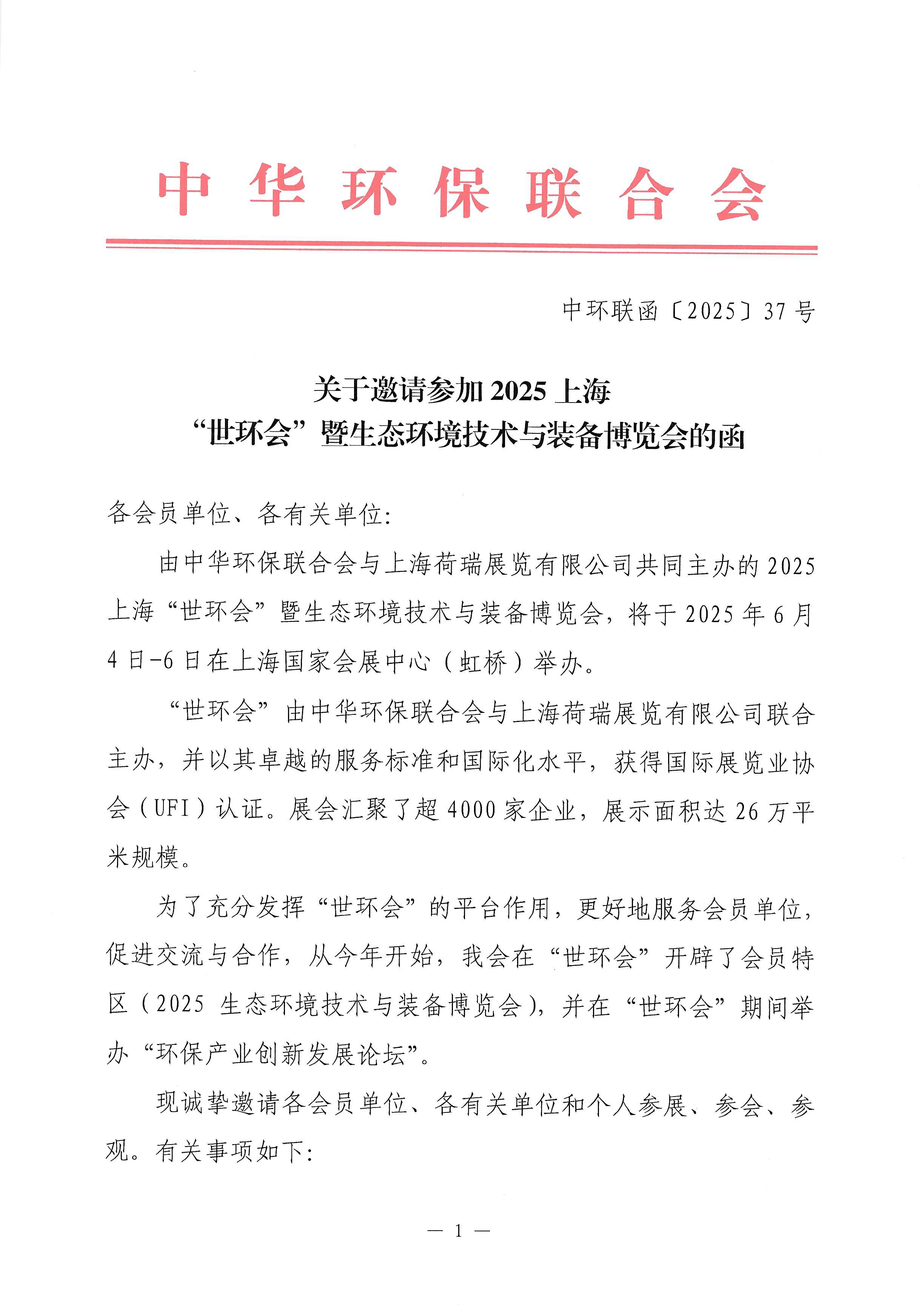 关于邀请参加2025上海“世环会”暨生态环境技术与装备博览会的函