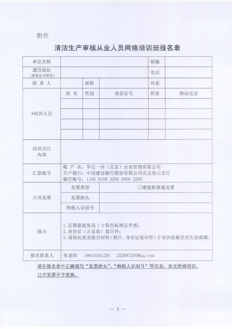 清洁生产审核从业人员网络培训班报名表