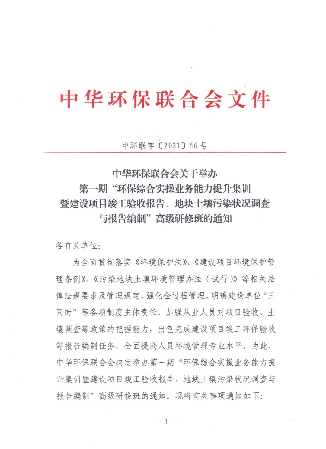 关于举办第一期“环保综合实操业务能力提升集训暨建设项目竣工验收报告、地块土壤污染状况调查与报告编制”高级研修班的通知