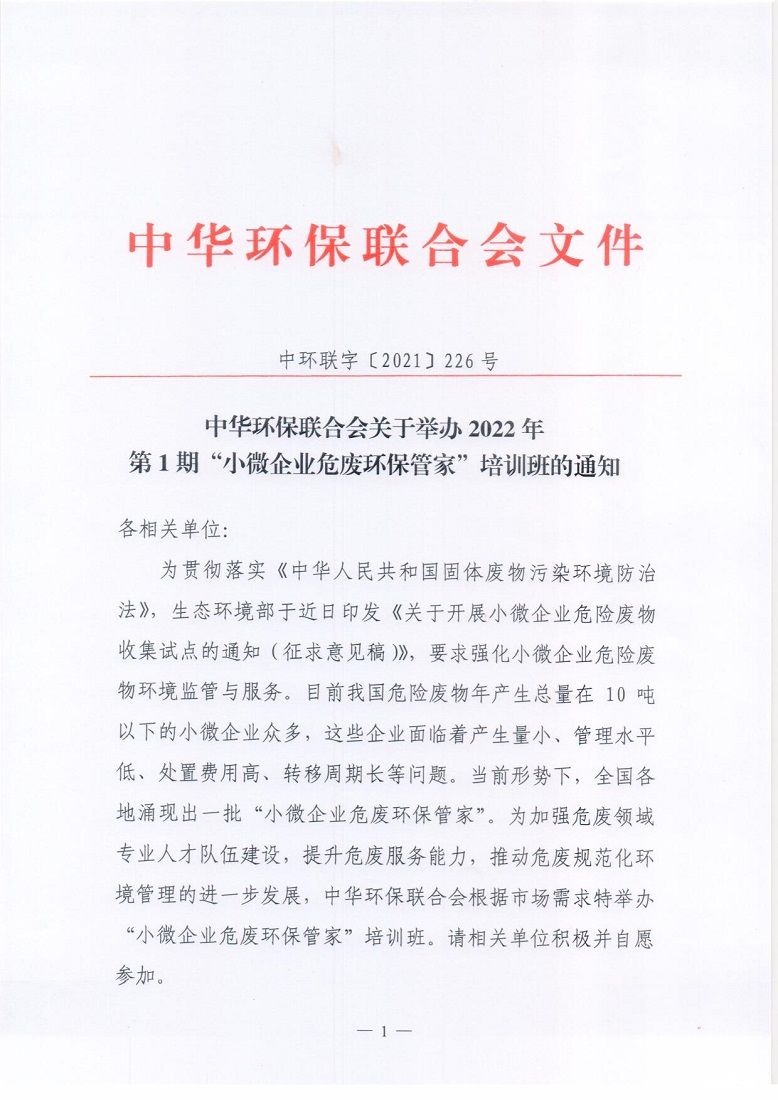 关于举办2022年第1期“小微企业危废环保管家”培训班的通知