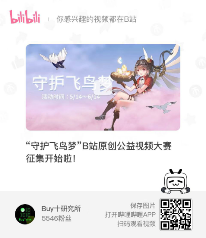 2022年5月14日-6月14日,制作“守护鸟类”相关视频,上传至BILIBILI平台,发布时加上话题#守护飞鸟梦#,并@Buy十研究所,成功参与大赛。