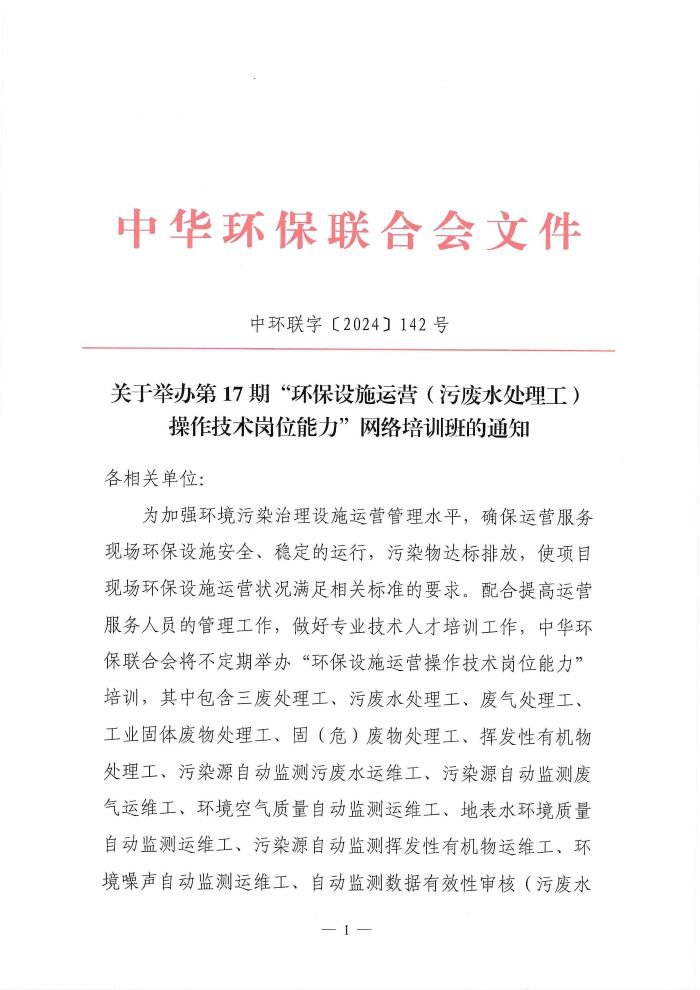 关于举办第17期“环保设施运营(污废水处理工)操作技术岗位能力”网络培训班的通知