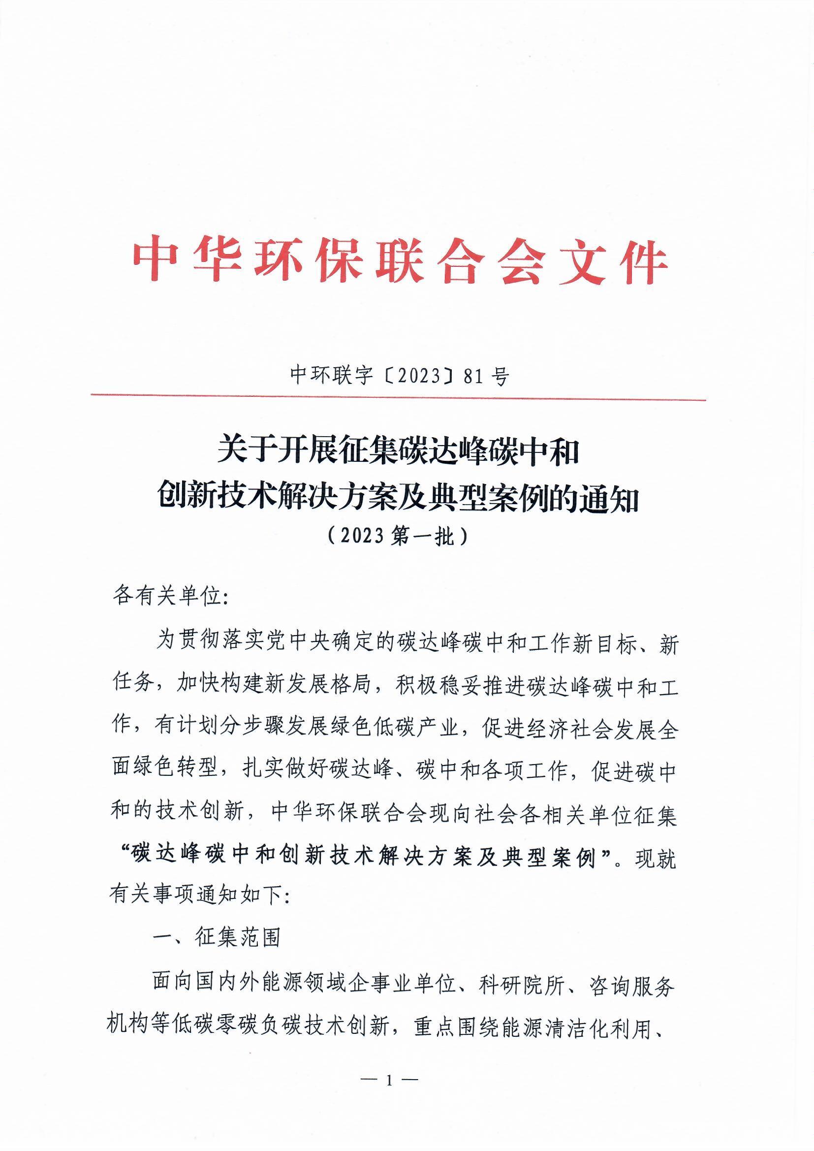 关于开展征集碳达峰碳中和创新技术解决方案及典型案例的通知(2023) (第一批)
